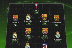 中場:居勒爾(皇馬)7.59分、費(fèi)爾明(巴薩)8.29分、佩德里(巴薩)7.45分、維尼修斯(皇馬)7.53分
