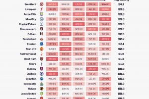 緊隨其后的是利物浦,其對(duì)手平均評(píng)分為93.5。紅軍將先后客場(chǎng)挑戰(zhàn)切爾西、主場(chǎng)迎戰(zhàn)曼聯(lián)、客場(chǎng)對(duì)陣布倫特福德、主場(chǎng)迎戰(zhàn)維拉,最后客場(chǎng)對(duì)陣曼城。