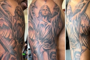 他在靠近肩膀處加上了一個(gè)天使圖案,往下是大衛(wèi)與歌利亞的場(chǎng)景,以及耶穌扛著十字架的圖案。