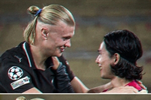 哈蘭德與南野拓實賽前擁抱寒暄,此役哈蘭德為曼城打進2球,而效力于摩納哥的南野拓實擔任替補未能出場。