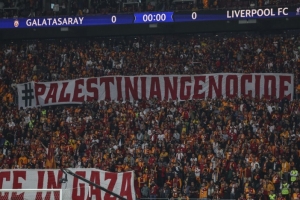 體育資訊10月3日訊 《巴黎人報》報道,在加拉塔薩雷1-0戰(zhàn)勝利物浦的歐冠比賽中,加拉塔薩雷球迷拉出許多橫幅,聲援巴勒斯坦民眾。