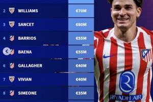 體育資訊10月3日訊 西甲球員身價(jià)更新,德轉(zhuǎn)列出西甲非皇馬和巴薩球員的身價(jià)前十,阿爾瓦雷斯1億歐第一。