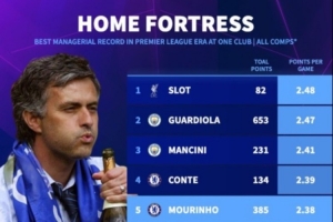 英超執(zhí)教單一球隊主場場均得分榜:斯洛特第一,瓜帥第二穆帥第五