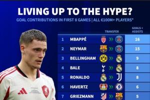 該榜單具體排名如下↓(只統(tǒng)計(jì)轉(zhuǎn)會(huì)費(fèi)>1億歐元的攻擊手,數(shù)據(jù)為進(jìn)球+助攻)