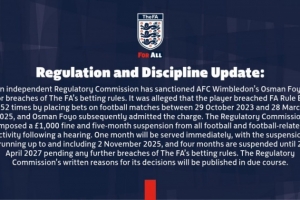 獨立監(jiān)管委員會已對AFC溫布爾登球員奧斯曼-福約違反博彩條例的行為作出處罰。據(jù)指控,該球員在2023年10月29日至2025年3月28日期間對足球比賽進(jìn)行投注,違反英足總E8條例252次。