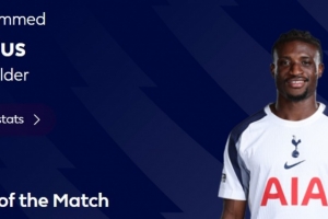 本場比賽熱刺球員庫杜斯發(fā)揮出色,打進(jìn)一球并且助攻一次,完成6次過人,賽后他也當(dāng)選英超官方球迷票選全場最佳球員。