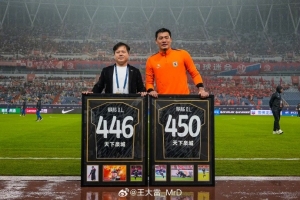 7月27日山東泰山對陣梅州客家的比賽,王大雷首發(fā)出戰(zhàn),他也以446場成為中國頂級聯(lián)賽出場王。在昨天泰山對陣玉昆賽前,王大雷領(lǐng)取了446場的紀念球衣,他同時還領(lǐng)取了中國頂級聯(lián)賽450次出場紀念球衣。