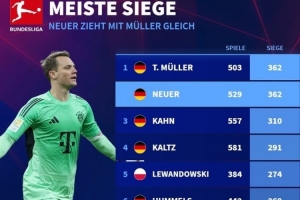體育資訊10月5日訊 德轉統(tǒng)計了德甲球員獲勝場次排名,諾伊爾362場追平托馬斯-穆勒,并列第一。