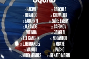 后衛(wèi):2-阿什拉夫、4-貝拉爾多、6-扎巴爾尼、21-盧卡斯-埃爾南德斯、25-努諾-門德斯、51-帕喬