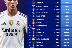 體育資訊10月5日訊 德轉(zhuǎn)此前更新了西甲球員身價(jià),并盤(pán)點(diǎn)了目前西甲球隊(duì)身價(jià)榜,具體如下: