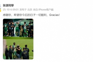 體育資訊10月6日訊 昨晚,北京國(guó)安俱樂(lè)部官方宣布主帥塞蒂恩離任。國(guó)安球員張?jiān)锤聜€(gè)人微博,向塞蒂恩送上祝福。