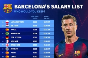 體育資訊10月10日訊 德國轉(zhuǎn)會(huì)市場(chǎng)列出了巴薩球員年薪排名,萊萬2080萬歐居首,德容1900萬歐次席。