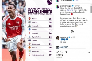 體育資訊10月10日訊 根據(jù)英超官方的數(shù)據(jù)統(tǒng)計,自2023-24賽季開始至今,阿森納零封場次在所有英超球隊中排名第一,他們有35場比賽沒有丟球。