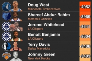 1、道格-韋斯特,累計(jì)凈勝分:-4052,出戰(zhàn)場(chǎng)次:676,場(chǎng)均凈勝分:-5.99。