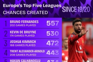 體育資訊10月10日訊 據(jù)Squawka統(tǒng)計(jì),2019-2020賽季以來,B費(fèi)創(chuàng)造557次機(jī)會(huì),五大聯(lián)賽同期最多。