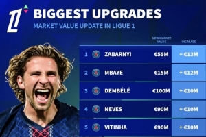 體育資訊10月12日訊 德國轉(zhuǎn)會市場更新法甲球員的身價(jià),并列出身價(jià)上漲榜單,扎巴爾尼+1300萬歐居首,巴黎球員占據(jù)前7名。