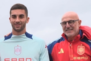 費蘭-托雷斯達成為西班牙隊出戰(zhàn)50場比賽里程碑,西班牙隊昨日訓練之前向他頒發(fā)了50場紀念球衣,全隊與費蘭合影表示祝賀。
