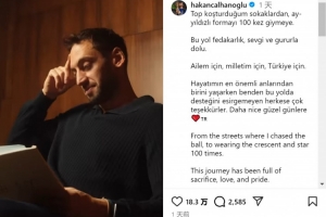 恰爾汗奧盧達成國家隊出戰(zhàn)100場里程碑,他在社交媒體上寫道:“從在街頭追逐足球,到身披星月戰(zhàn)袍(土耳其隊球衣)出戰(zhàn)百場。這段旅程充滿了犧牲、熱愛與驕傲。為我的家人,為我的祖國,為土耳其?!?/p>