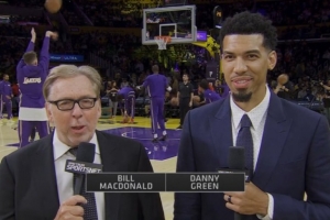 體育資訊10月13日訊 今日前NBA球員、現(xiàn)湖人電臺Spectrum SportsNet解說員丹尼-格林現(xiàn)場解說湖人VS勇士的季前賽。