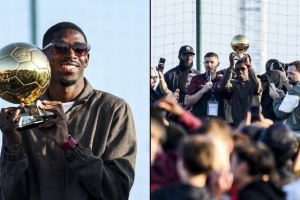 法國足協(xié)曬照,登貝萊回到成長之地埃夫勒,向家鄉(xiāng)人民展示了他的金球獎(jiǎng)。