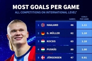 體育資訊10月13日訊 德國轉(zhuǎn)會市場統(tǒng)計了足壇歷史球員在國家隊的場均進球數(shù)量,并列出榜單,哈蘭德1.11球居首,蓋德-穆勒、柯奇士次席。