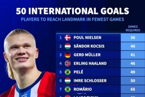 體育資訊10月13日訊 在上周對陣以色列的世預(yù)賽中,哈蘭德上演帽子戲法,這讓他成為歷史上第4快打入國家隊(duì)第50球的球員。作為對比,梅西用了107場才達(dá)到這一里程碑,而C羅則用了114場。德轉(zhuǎn)列出了達(dá)成國家隊(duì)50球所用場次最少的球員?。