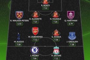 中場:庫杜斯(熱刺,7場1進球5助攻)、蘇維門迪(阿森納,7場2進球)、扎卡(桑德蘭,7場3助攻)、格拉利什(埃弗頓,7場1進球4助攻)
