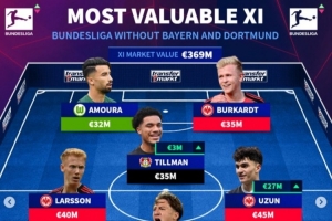 中場:詹-烏尊(法蘭克福,4500萬歐)、斯蒂勒(斯圖加特,4500萬歐)、雨果-拉爾森(法蘭克福,4000萬歐)、蒂爾曼(勒沃庫森,3500萬歐)
