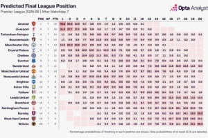 體育資訊10月15日訊 英超七輪過后,數(shù)據(jù)機(jī)構(gòu)OPTA超級計(jì)算機(jī)預(yù)測本賽季英超冠軍↓