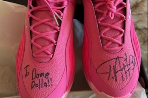 字母哥給利拉德的是他最新發(fā)布的簽名鞋F(xiàn)reak 7,字母哥也貼心的簽上了“to簽”,寫(xiě)了利拉德的外號(hào)“Dame Dolla”。