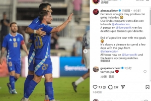 麥卡利斯特社媒曬出比賽照片,并寫道:“以兩粒進球結束了積極的國際比賽日之旅,與國家隊伙伴們共度數日時光總是令人感到愉快。”