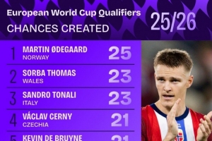 體育資訊10月15日訊 據(jù)Squawka統(tǒng)計(jì),厄德高是本屆歐洲世預(yù)賽創(chuàng)造機(jī)會(huì)最多的球員。