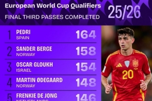 體育資訊10月15日訊 Squawka列出了歐洲世預賽進攻三區(qū)成功傳球排名,西班牙中場佩德里居首。