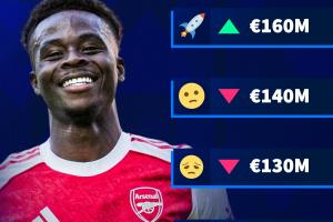 體育資訊10月15日訊 德國(guó)足球轉(zhuǎn)會(huì)市場(chǎng)將在10月17日更新英超球員身價(jià),目前德轉(zhuǎn)已經(jīng)陸續(xù)放出了一批球員的身價(jià)變動(dòng)進(jìn)行預(yù)熱,阿森納前鋒薩卡位列其中。