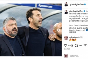 意大利國家隊領隊布馮社媒曬出與主帥加圖索的合照,并寫道:“昨晚比賽的結果非常重要,但更令我自豪的是藍衣軍團在賽場上展現(xiàn)的態(tài)度和個性。”