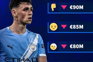 體育資訊10月16日訊 明日德轉將更新英超球員身價,德轉官方社媒今日發(fā)圖預熱福登身價變化,球員身價必定下跌,最多跌至7500萬。