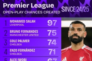 體育資訊10月16日訊 日前,Squawka統(tǒng)計了英超運動戰(zhàn)創(chuàng)造機會次數(shù)排行,薩拉赫居首,B費、帕爾默分居二三位。
