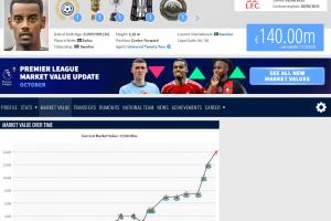體育資訊10月17日訊 德國轉(zhuǎn)會市場今天更新了英超球員的身價,利物浦今夏創(chuàng)紀錄引進的前鋒伊薩克從1.2億歐漲至1.4億歐,德轉(zhuǎn)管理員解釋了此次上漲的原因。