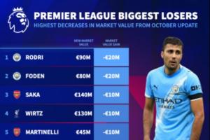體育資訊10月17日訊 德轉(zhuǎn)更新英超身價(jià),其中跌的最多的是羅德里和福登,他們身價(jià)都下降了2000萬歐。