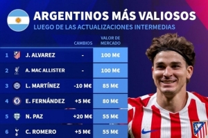 體育資訊10月18日訊 德國轉(zhuǎn)會市場更新了部分球員的身兼,并列出阿根廷球員德轉(zhuǎn)身價排名,阿爾瓦雷斯、麥卡利斯特1億歐居首。