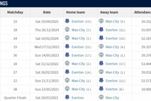 體育資訊10月18日訊 英超第8輪,曼城主場對陣埃弗頓。雙方近10次交手,曼城8勝2平保持不敗,進23球失3球。