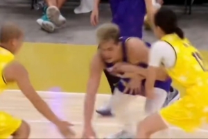 比賽當中,郭艾倫與女籃前國手趙爽拉開單挑,一波蝴蝶穿花運球甚至晃倒趙爽,隨后躲開曹芳干擾上籃打進。