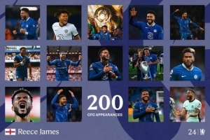 切爾西官推曬出海報,并寫道:“200場里程碑取得進球,里斯-詹姆斯是純血切爾西人。”