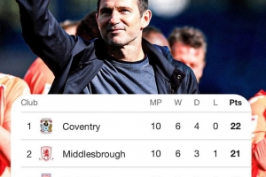 考文垂本賽季前10場英冠6勝4平保持不敗,在積分榜上以1分優(yōu)勢領(lǐng)先米德爾斯堡位居榜首,球隊10場比賽打進(jìn)29球(聯(lián)賽最多),只丟7球(已經(jīng)連續(xù)5場零封)。