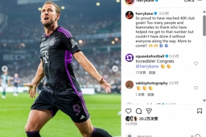 凱恩也在社媒發(fā)文紀念這一特殊時刻,寫道:“很自豪能夠完成俱樂部生涯400球,達成這一紀錄得益于太多人的幫助,沒有大家一路的支持我不可能做到。未來還有更多進球!”