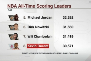 杜蘭特在NBA職業(yè)生涯總得分榜上排名第八(30571),若按照上賽季場(chǎng)均得分(26.6分),只需要65場(chǎng)比賽,他將超越邁克爾-喬丹(32292)。
