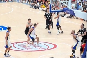 在本場比賽中,周鵬因?qū)κ址朗刳w睿動作過大,揮拳直接把赫羅納男籃的14號干翻。