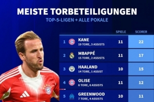 體育資訊10月20日訊 《轉(zhuǎn)會(huì)市場》統(tǒng)計(jì)了本賽季五大聯(lián)賽球員在俱樂部各項(xiàng)賽事的直接參與進(jìn)球總數(shù)情況,凱恩、姆巴佩、哈蘭德分列前三。