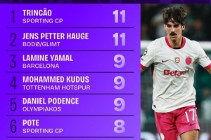 本賽季歐冠完成過人榜:特林康和海于格11次分列前二,亞馬爾第三