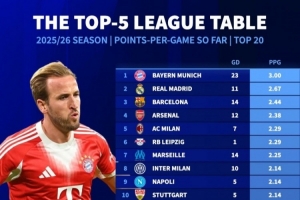體育資訊10月25日訊 《轉(zhuǎn)會市場》統(tǒng)計了本賽季五大聯(lián)賽球隊的場均拿分情況,拜仁、皇馬、巴薩、阿森納分列前四。